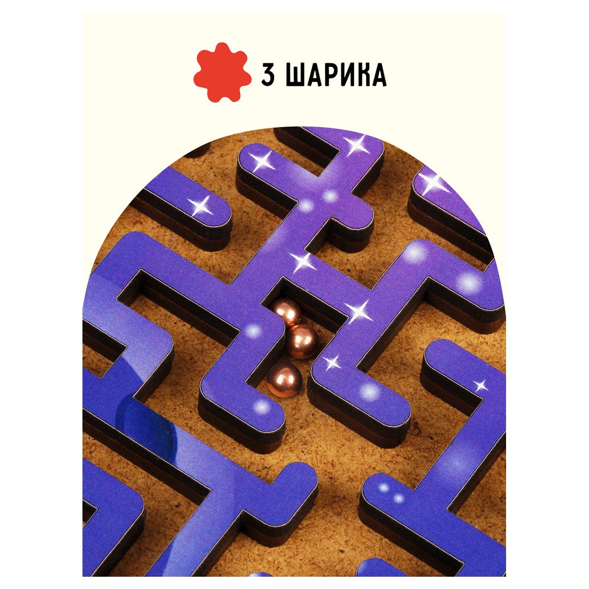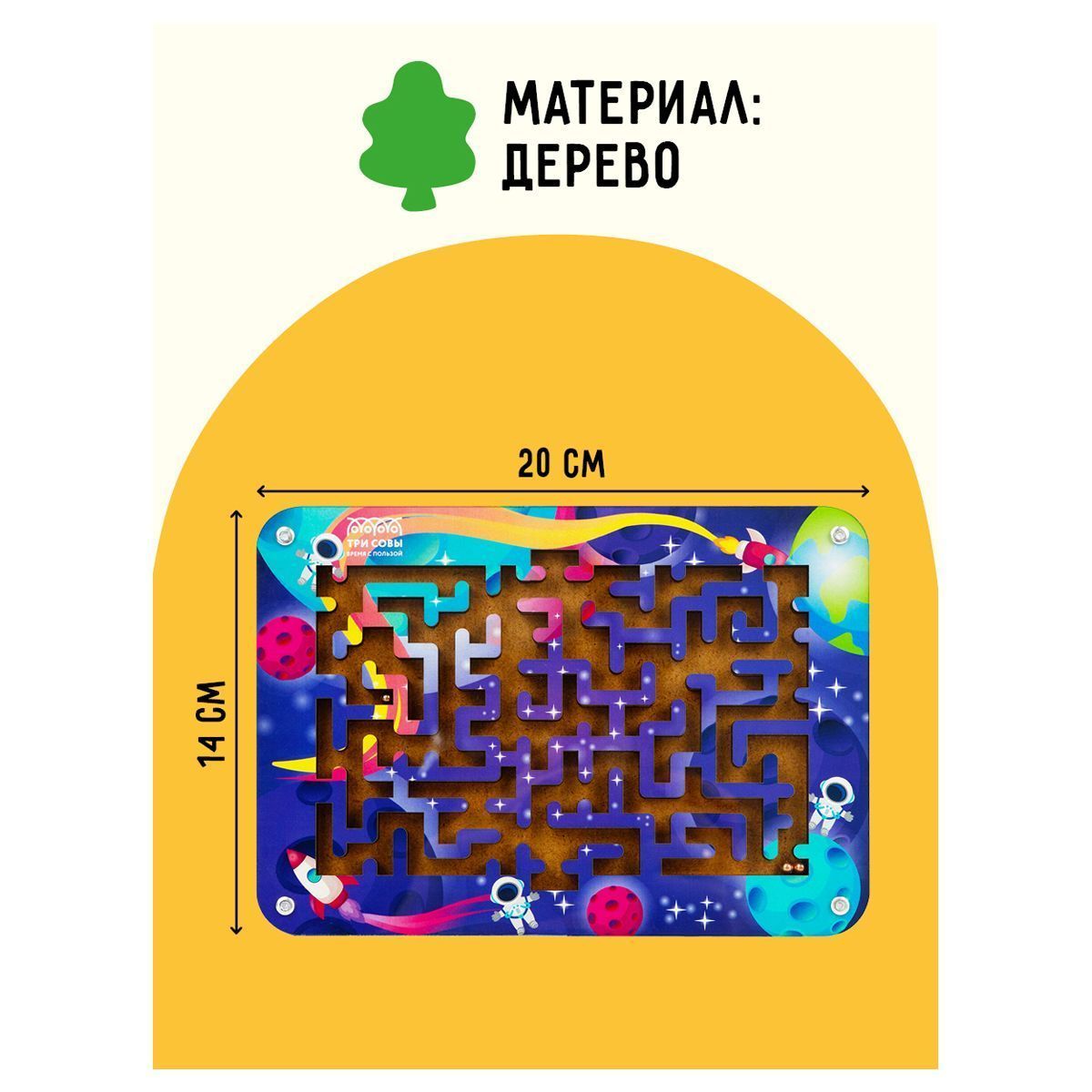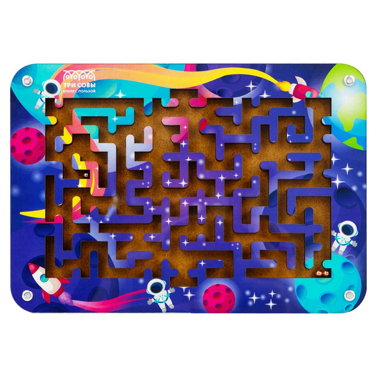 Настольная игра «Лабиринт» бренда «ТРИ СОВЫ» представляет собой планшет с интересными изображениями и замысловатыми дорожками, на которых расположены подвижные металлические шарики.
