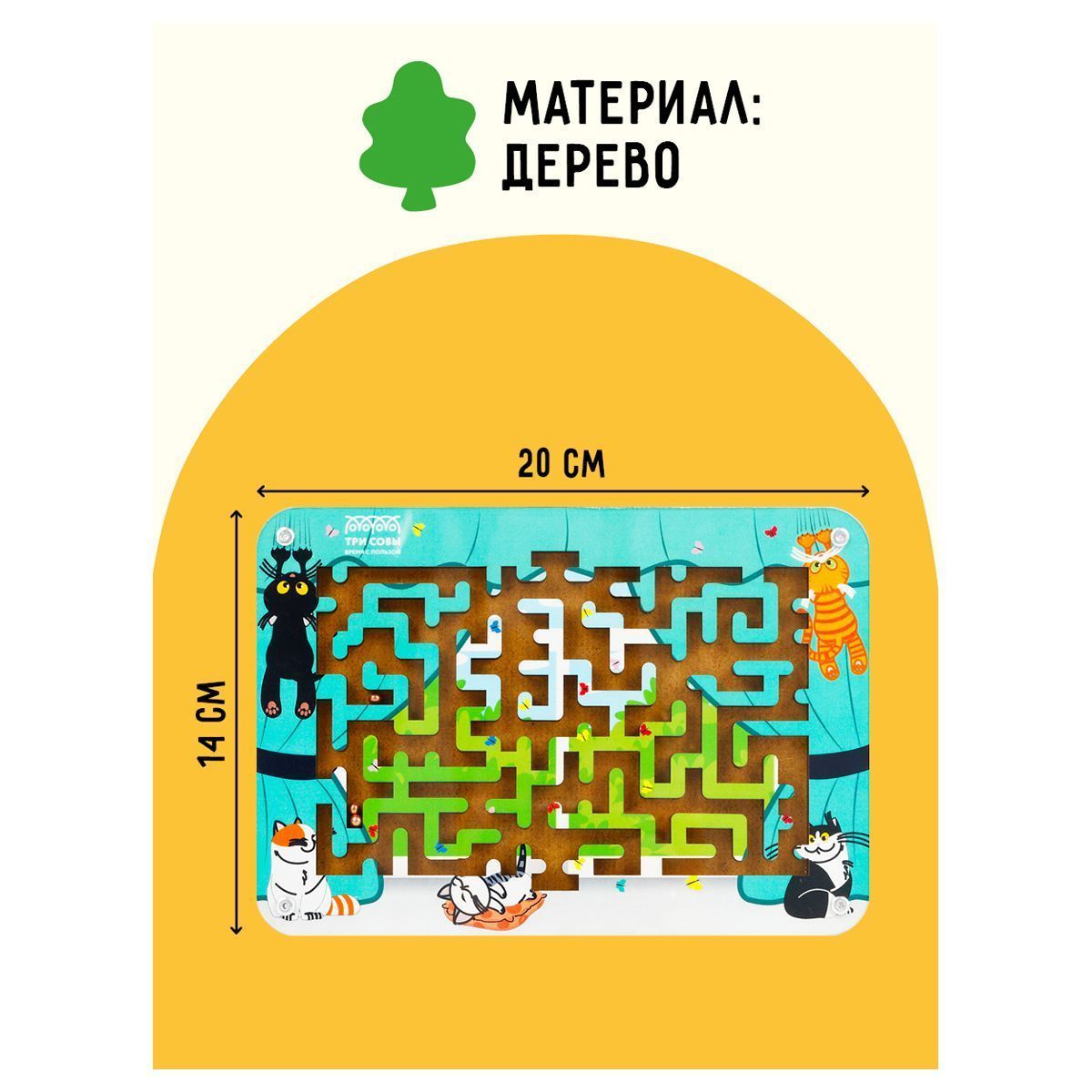 Настольная игра «Лабиринт» бренда «ТРИ СОВЫ» представляет собой планшет с интересными изображениями и замысловатыми дорожками, на которых расположены подвижные металлические шарики.