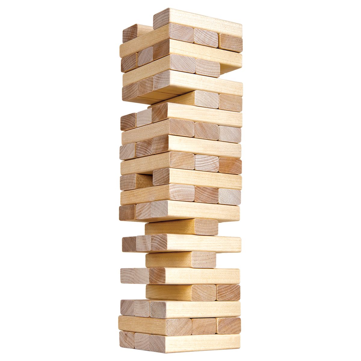 - Игроков может быть столько, сколько собралось друзей. Каждый игрок выбирает ряд, вытаскивает одной рукой брусок и укладывает на новый, верхний ряд башни.