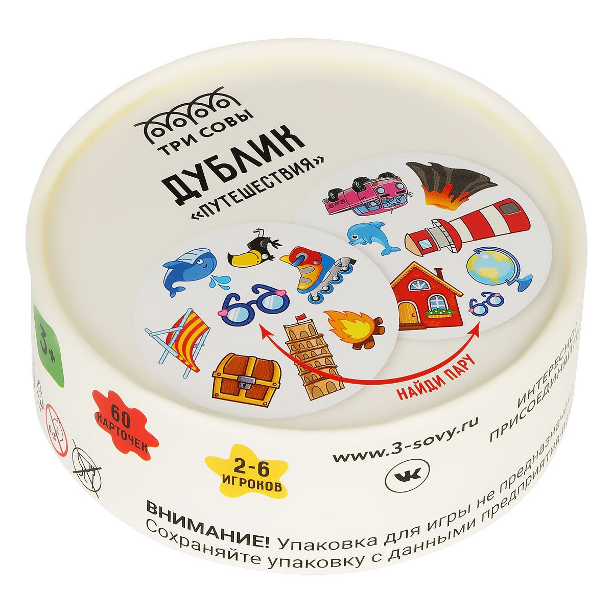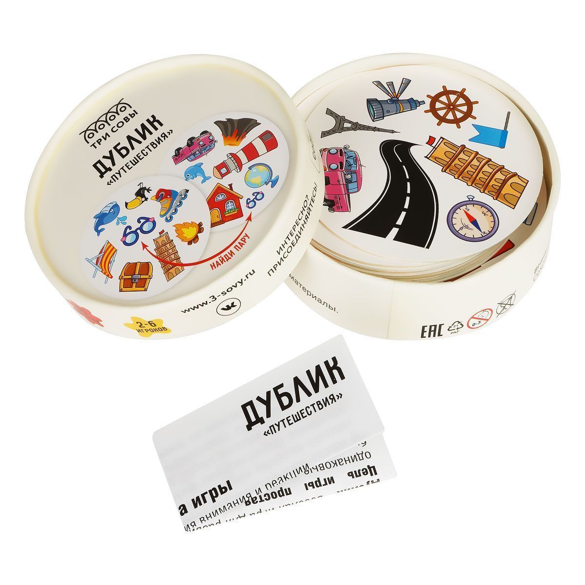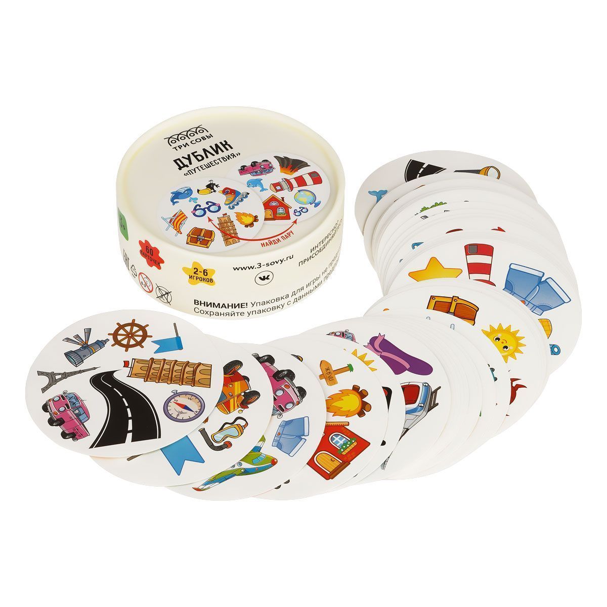 В наборе «ТРИ СОВЫ» карточки с разными картинками. Игрокам необходимо найти совпадающие изображения быстрее всех.