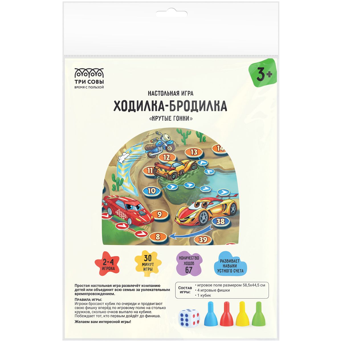 Простая настольная игра ТРИ СОВЫ «Ходилки-бродилки. Крутые гонки» развлечёт компанию детей или объединит всю семью за увлекательным времяпрепровождением.