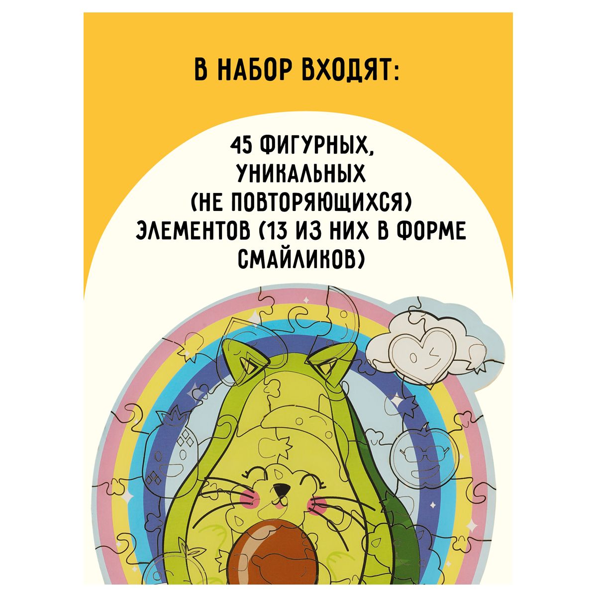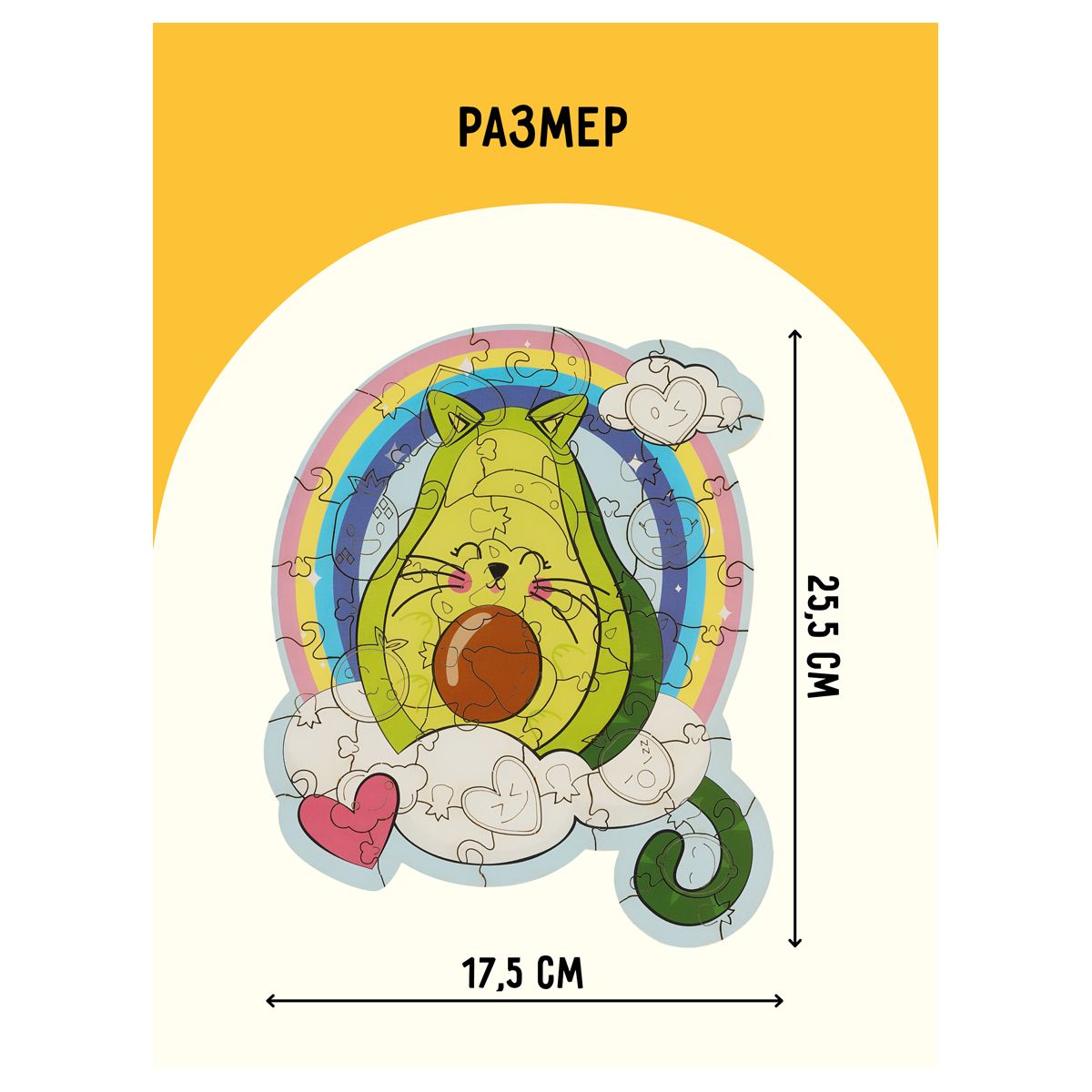 Пазл «Авокадо» состоит из 45 уникальных частей, некоторые из них имеют форму тематики картинки. Размер – 17.5 x 25.5 см.