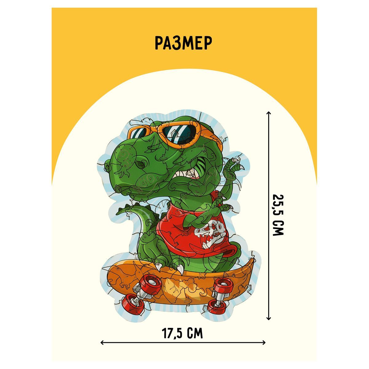 Пазл «Динозавр» состоит из 45 уникальных частей, некоторые из них имеют форму тематики картинки. Размер – 17.5 x 25.5 см.
