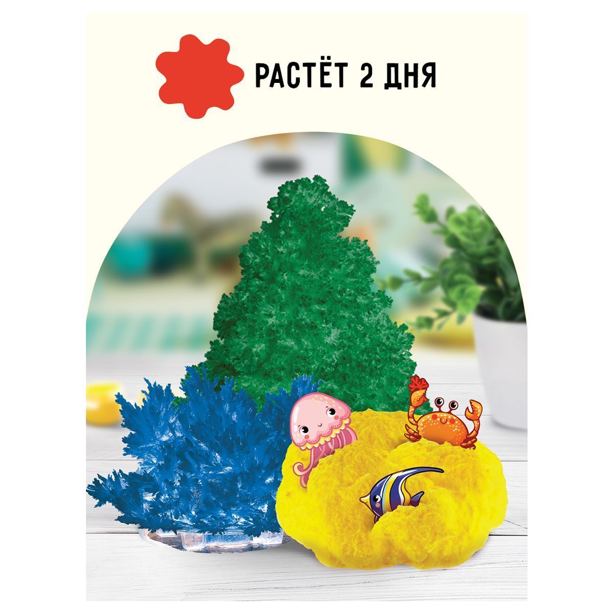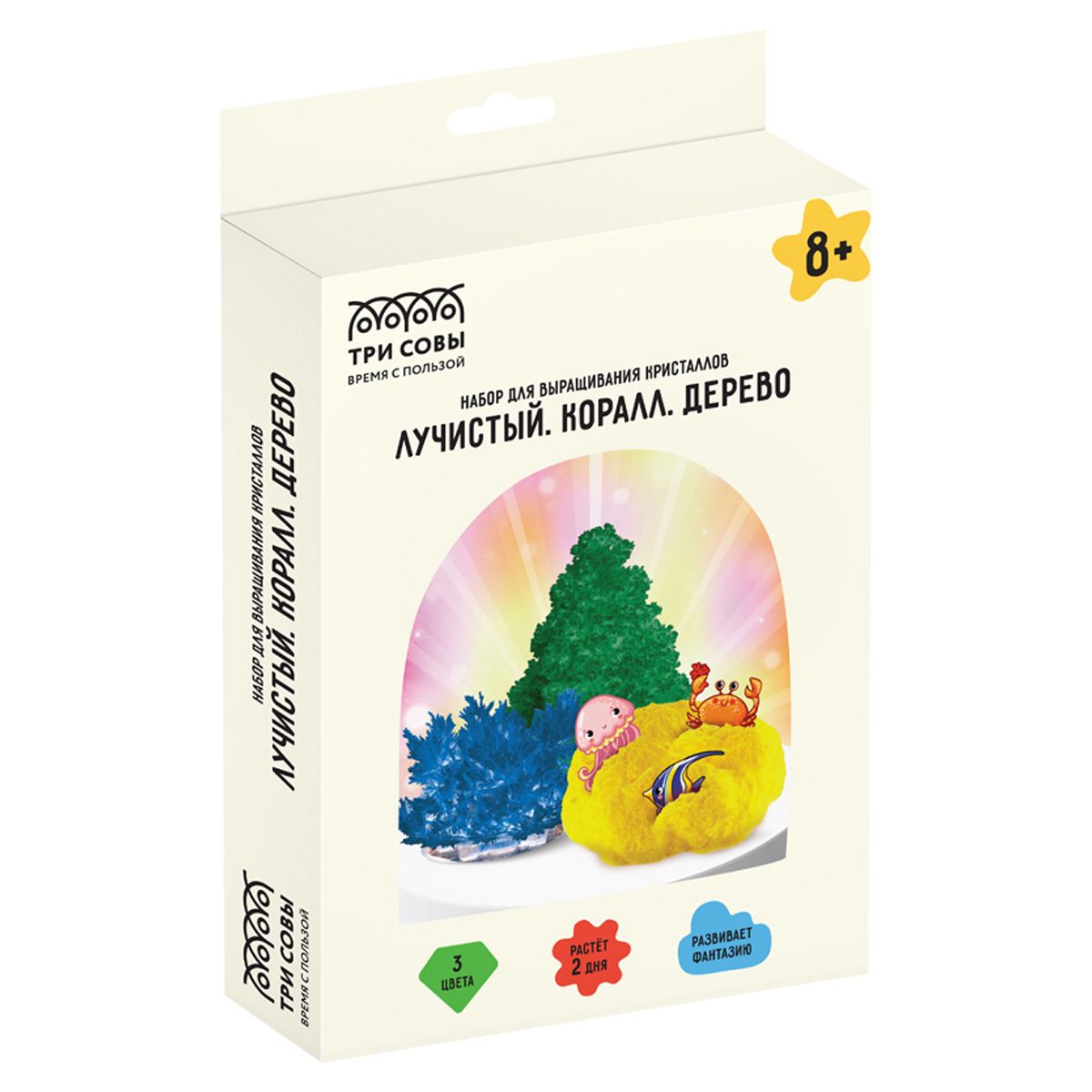 Цвета кристаллов: «Лучистый» – синий, «Коралл с морскими обитателями» – желтый, «Дерево» – зелёный. Набор познакомит вашего ребенка с химическими процессами, поможет развить любознательность и позволит самостоятельно поставить первый научный эксперимент! Проводя опыт, ребенок сможет оценить форму, цвет, вид и структуру каждого кристалла.