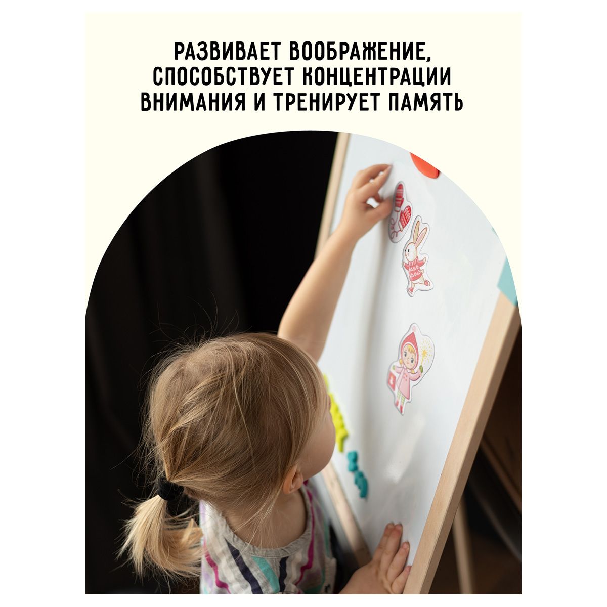 В наборе 31 красочный элемент, которые позволят малышу самостоятельно придумывать варианты игры и увлекательно изучать окружающий мир. Детали хорошо крепятся к любой металлической поверхности и легко снимаются детскими пальчиками.
