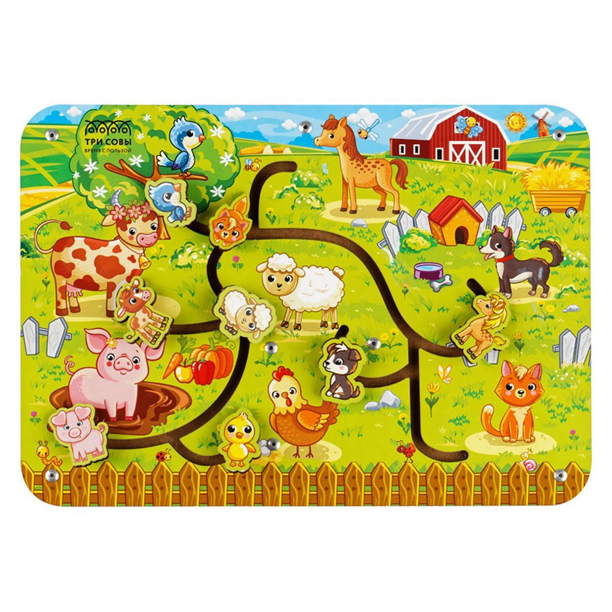 Лабиринт «Ферма» бренда «ТРИ СОВЫ» представляет собой планшет с замысловатыми дорожками, на которых расположены подвижные фигурки с изображениями домашних животных.