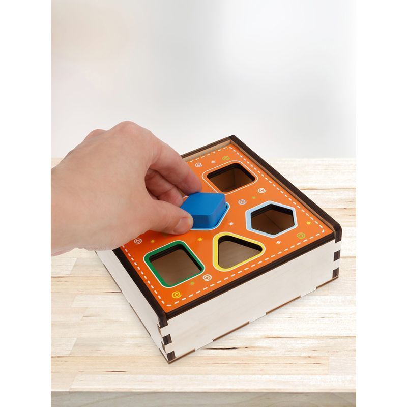 В наборе семь геометрических фигур, которые окрашены в цвета радуги. Сортер выполнен в форме шкатулки с отверстиями на крышке. Задача ребенка − подобрать фигуру к соответствующему по форме отверстию в шкатулке. Цветной контур отверстия подскажет ребенку, фигура какого цвета ему соответствует.