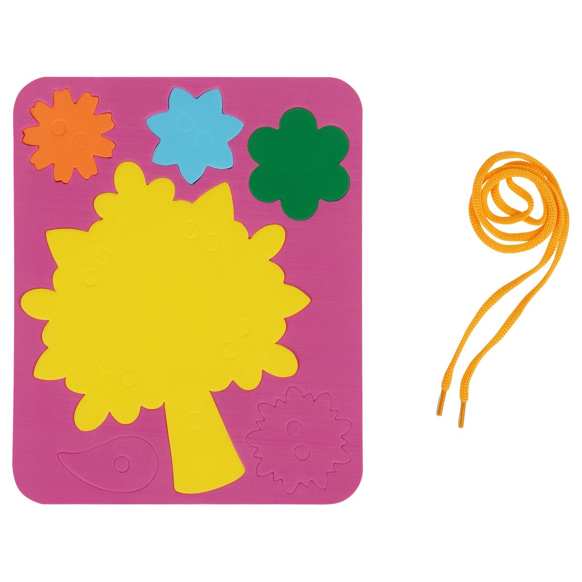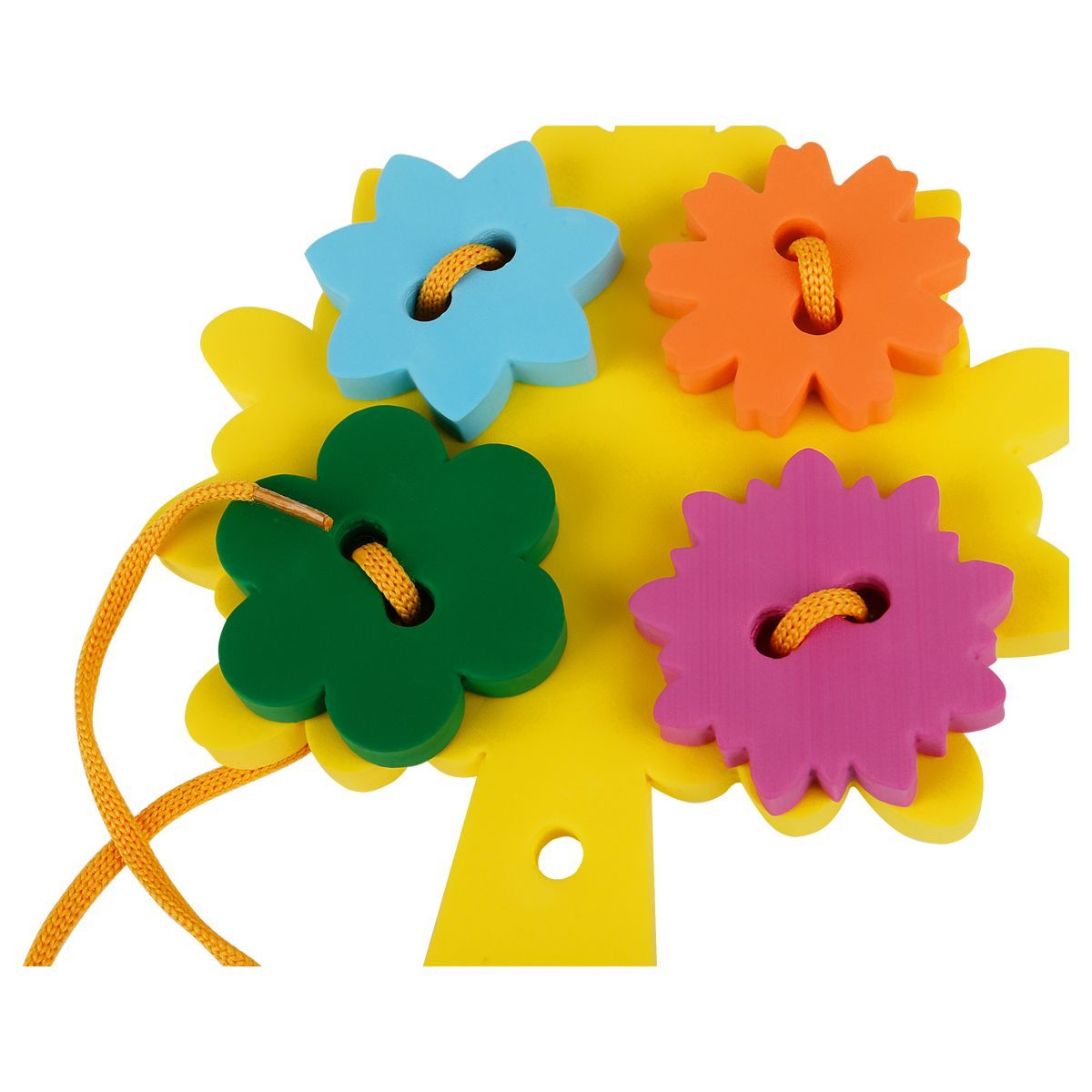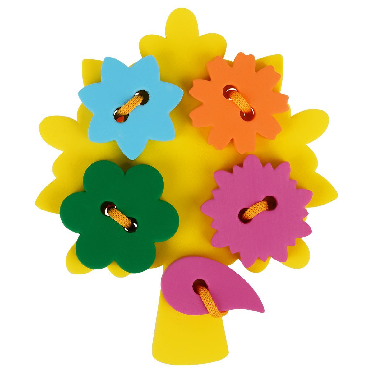 Игрушка «Дерево» выполнена из мягкого и яркого материала ЭВА. Элементы игры имеют крупные отверстия по центру каждой фигурки для того, чтобы ребенку удобно было нанизывать их на шнурок и пришнуровывать к основе.