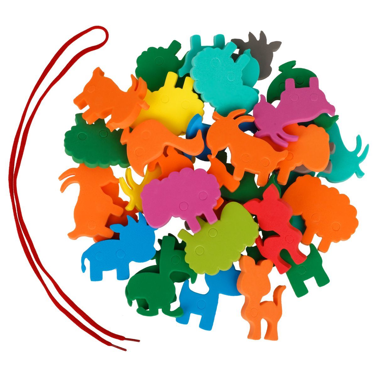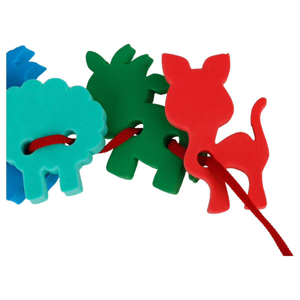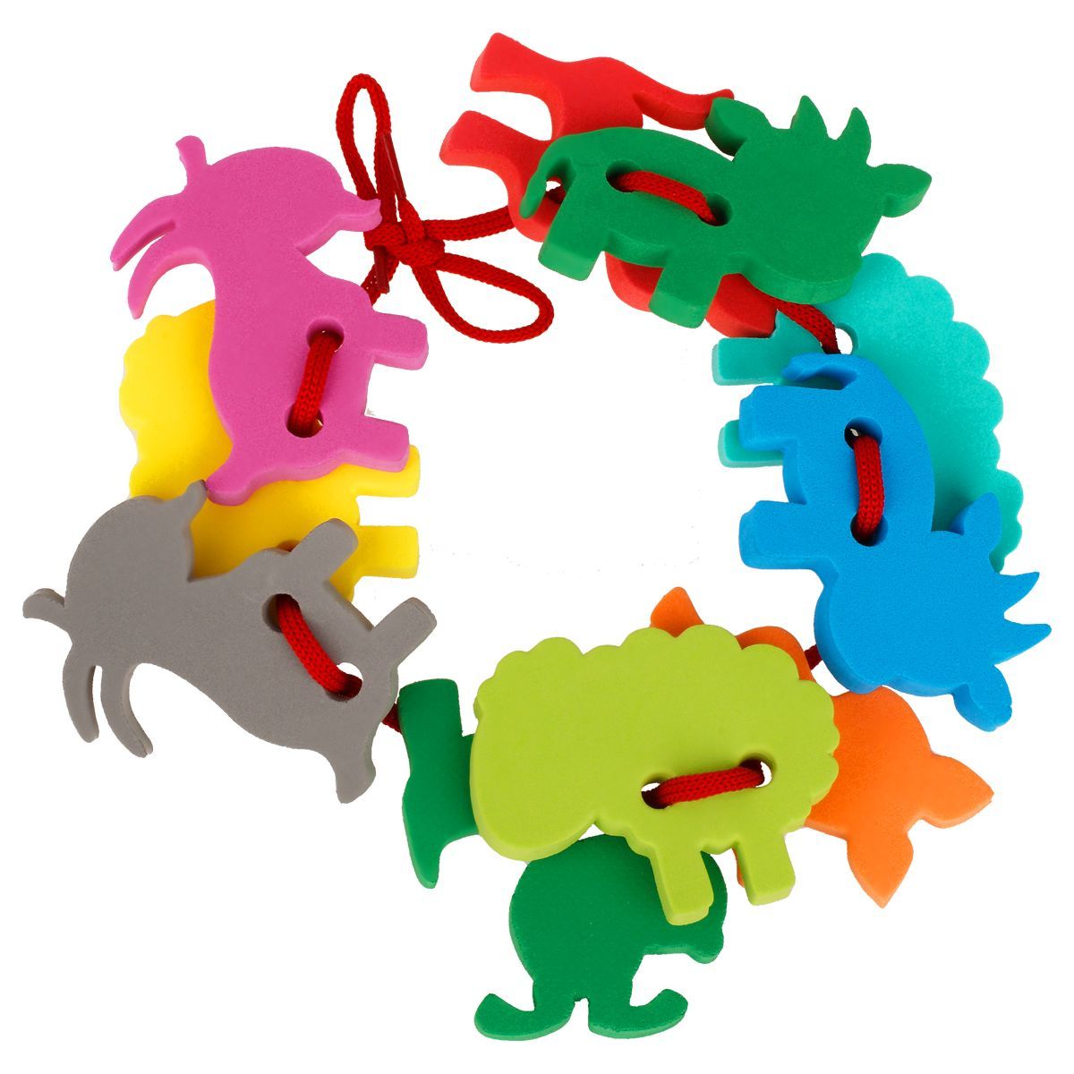 В наборе «Ферма» собраны разные цветные фигуры животных. Детали игрушки имеют крупное отверстие по центру каждой фигурки для нанизывания на шнуровку. Можно играть в ванной.