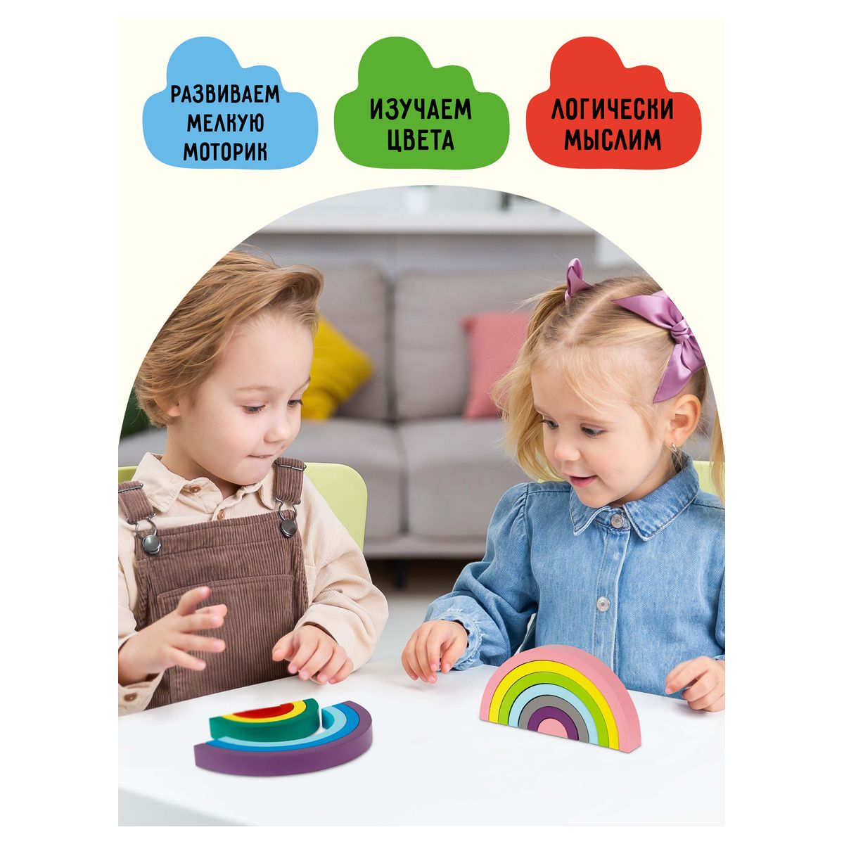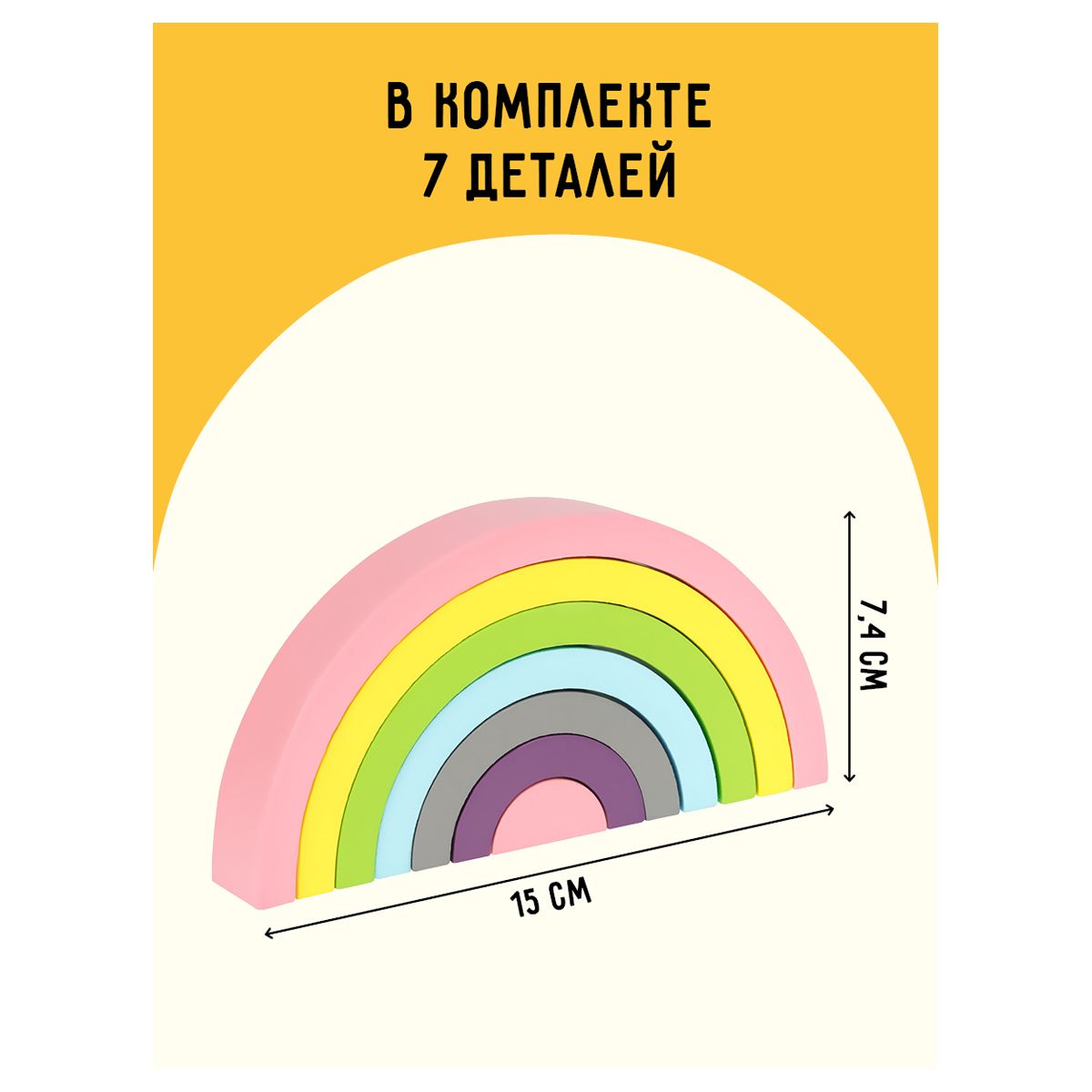 Пирамидка «Радуга-дуга» состоит из семи элементов пастельных цветов радуги. Развивающая игрушка воспитывает в детях чувство цветовой гармонии, сортировке по размеру, логике и развивает воображение.