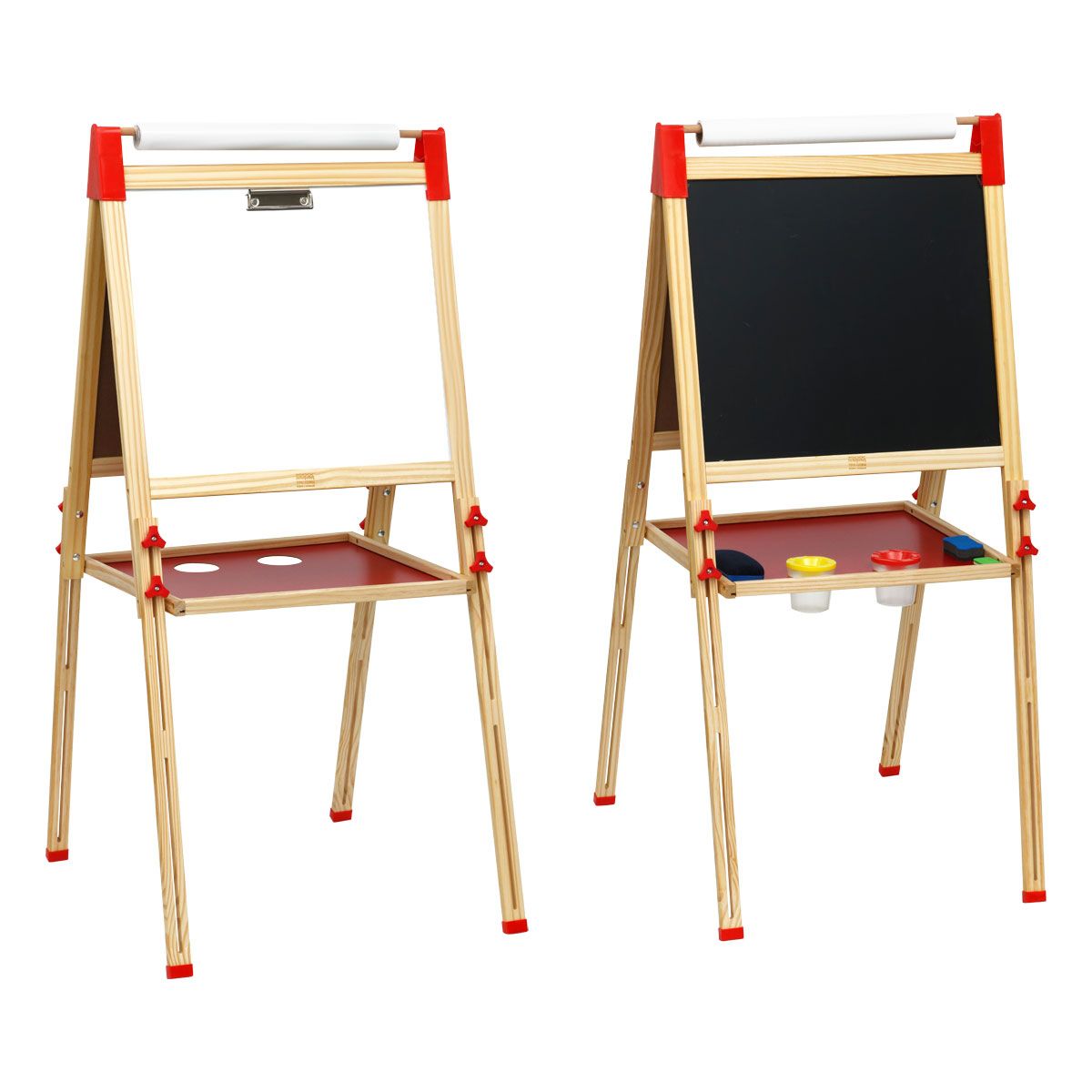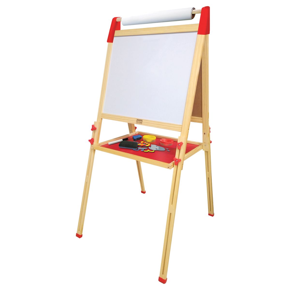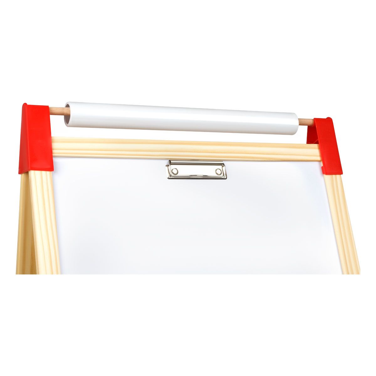 Одна сторона доски имеет магнитное покрытие, на котором также можно рисовать маркером, вторая сторона предназначена для рисования мелом. Сверху закреплен рулон бумаги, на которой можно рисовать карандашами, фломастерами, красками, восковыми мелками.