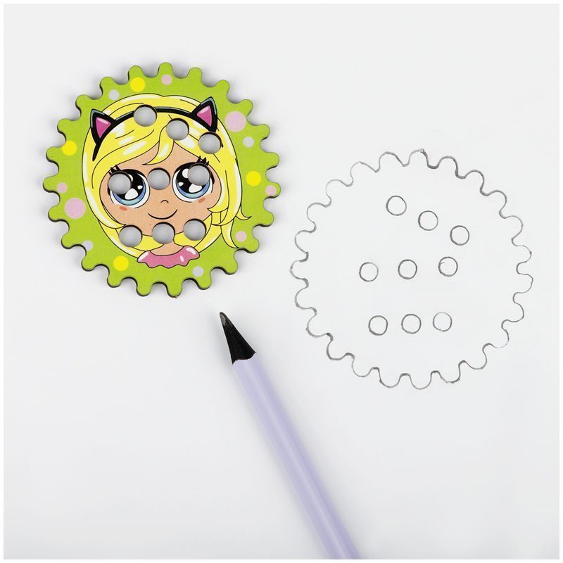 Спирограф состоит из 2 зубчатых колес с фигурными трафаретами для рисования и 5 кругов-шестерёнок. Размер игры – 25.5 x 25.5 x 3 см.