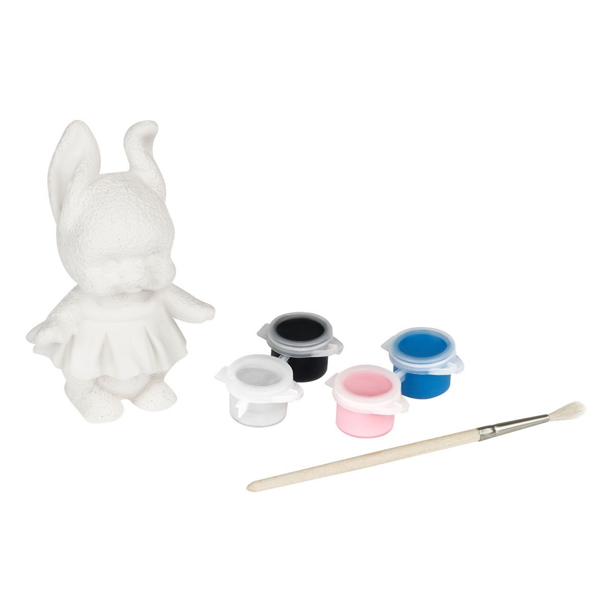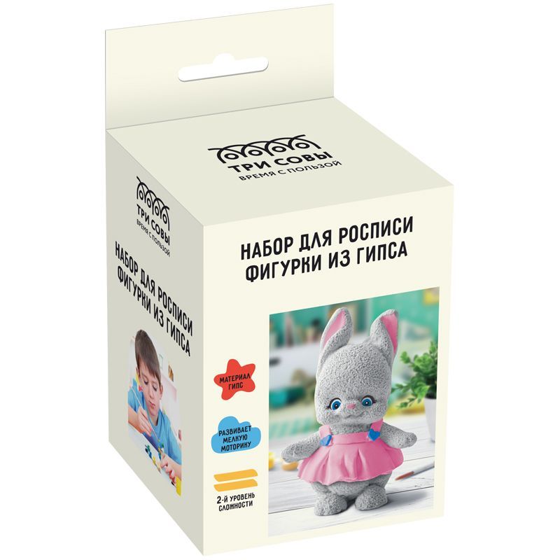 В состав набора «Зайка Мила» входит: гипсовая фигурка, краски гуашь, кисточка. В итоге у вас получится фигурка 8.5 см. Набор упакован в картонную коробку.