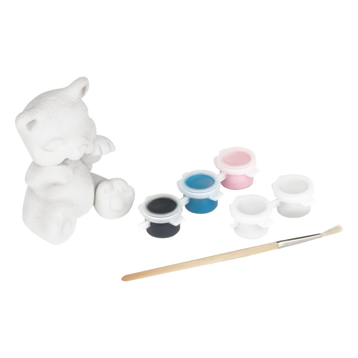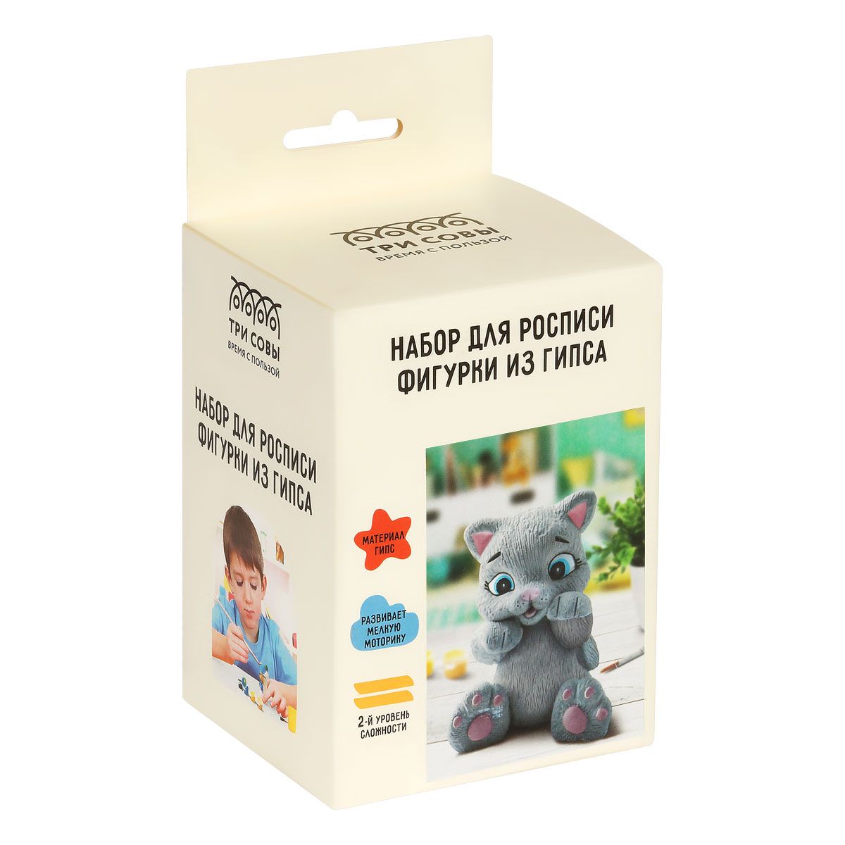 В состав набора «Котенок» входит: гипсовая фигурка, краски гуашь, кисточка. В итоге у вас получится фигурка 8.5 см. Набор упакован в картонную коробку.