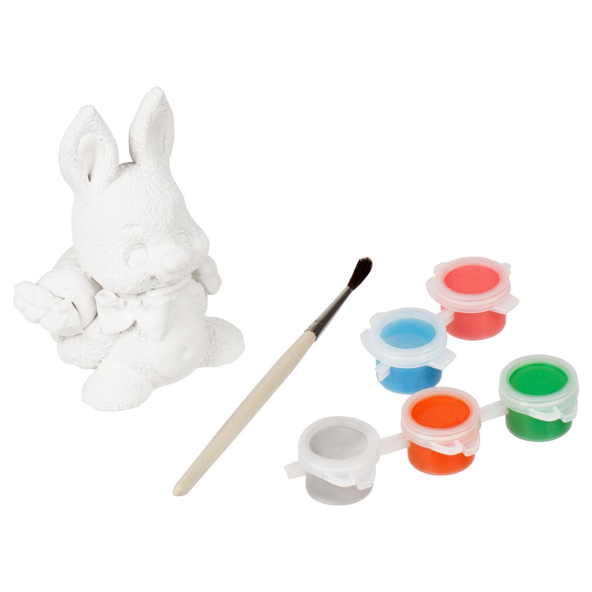 В состав набора «Зайка с подарком» входит: гипсовая фигурка, краски гуашь, кисточка. В итоге у вас получится фигурка 8.5 см. Набор упакован в картонную коробку.