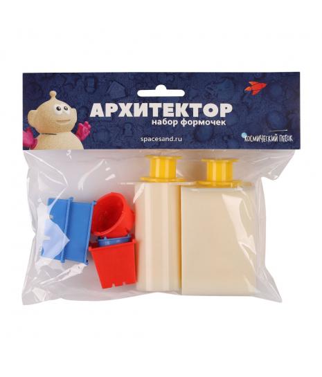 Набор формочек «Архитектор» состоит из 7 элементов. Большие формы предназначены для строительства вертикальных кирпичиков, достаточно поместить песок в кирпичик и выдавить его от туда при помощи поршня. Маленькие формочки завершат образ песочного замка.