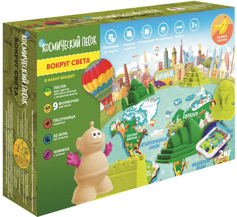 Большой тематический набор для интересных игр! В комплект входит надувная песочница 40х60 см, 2 кг песка в двух цветах(зеленый + желтый с ароматом банана), 9 формочек для лепки, картонные игровые элементы, игровое поле, книжка с развивающими играми и пошаговыми инструкциями создания фигурок.