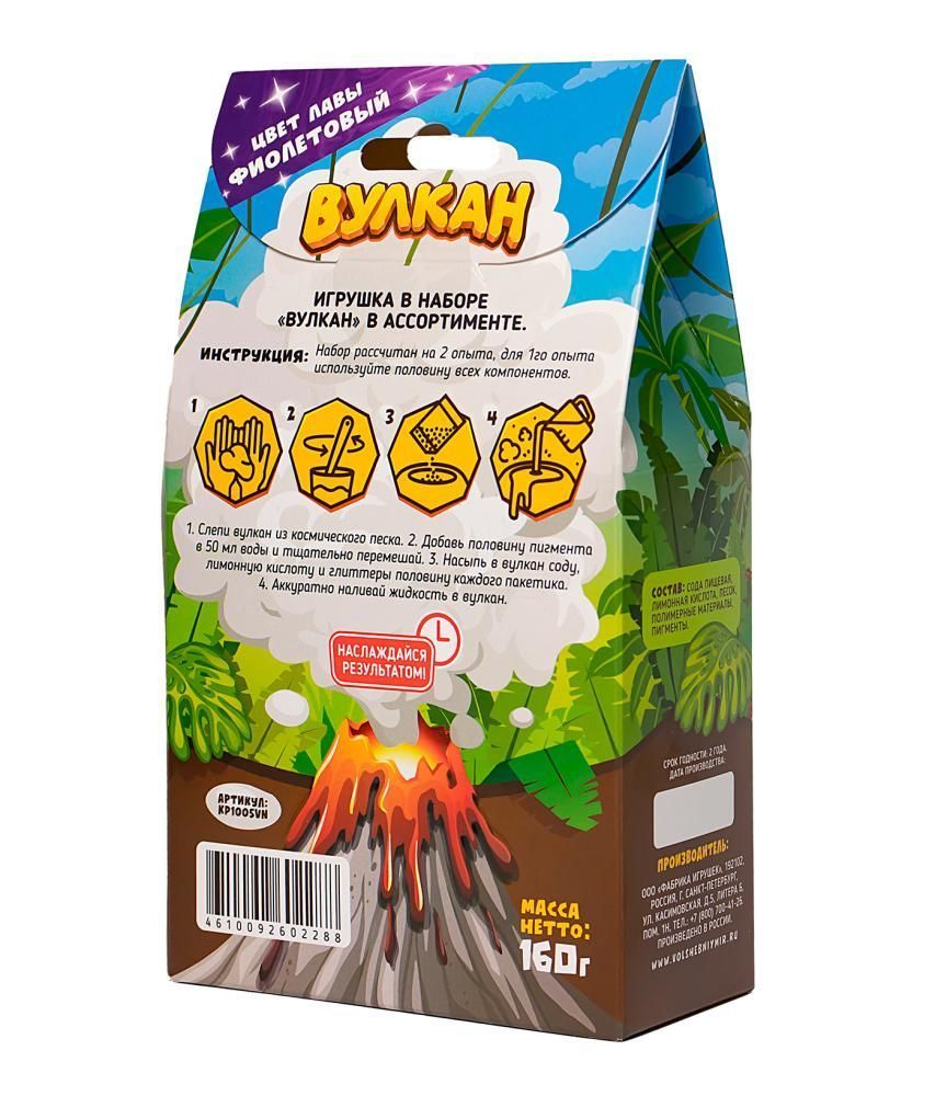 - Комплектация: цвет лавы: фиолетовый, космический песок классического цвета, лимонная кислота, пищевая сода, глиттеры, пигмент, понятная инструкция