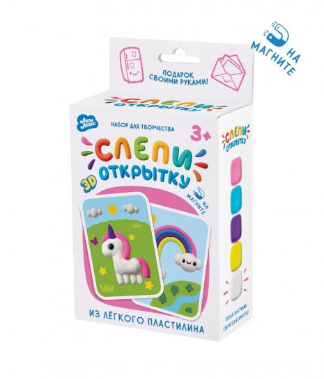 Набор для создания 3D открытки из легкого пластилина, с магнитом в комплекте. Легкий пластилин ТМ Лепи легко невероятно воздушный на ощупь! Так легко лепить еще никогда не было: создай и подари самую милую открытку! Сделай подарок своими руками для самых любимых. Внимание - белый легкий пластилин светится в темноте! В набор входят: 2 цветные открытки с милыми персонажами 2 магнита 5 пакетиков легкого пластилина, в том числе 1 пакетик со светящимся в темноте глазки стек Легкий пластилин ТМ Лепи легко - просто находка для творчества: Застывает на воздухе в фигурку за 12* часов. Супер мягкий и легкий, приятный на ощупь. Нет необходимости разминать массу перед лепкой. Отлично держит любую форму. Не липнет и не остается на руках. Безопасный для кожи. Имеет приятный фруктовый аромат. *Время полного засыхания зависит от объема массы, температуры и влажности помещения. Дepжите массу в зaкpытoм видe, чтoбы нe дoпуcтить выcыxaния.