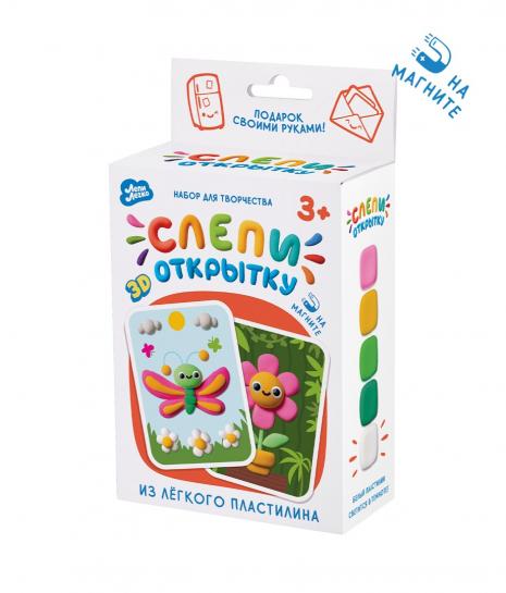 Набор для создания 3D открытки из легкого пластилина, с магнитом в комплекте. Легкий пластилин ТМ Лепи легко невероятно воздушный на ощупь! Так легко лепить еще никогда не было: создай и подари самую милую открытку! Сделай подарок своими руками для самых любимых. Внимание - белый легкий пластилин светится в темноте! В набор входят: 2 цветные открытки с милыми персонажами 2 магнита 5 пакетиков легкого пластилина, в том числе 1 пакетик со светящимся в темноте глазки стек Легкий пластилин ТМ Лепи легко - просто находка для творчества: Застывает на воздухе в фигурку за 12* часов. Супер мягкий и легкий, приятный на ощупь. Нет необходимости разминать массу перед лепкой. Отлично держит любую форму. Не липнет и не остается на руках. Безопасный для кожи. Имеет приятный фруктовый аромат. *Время полного засыхания зависит от объема массы, температуры и влажности помещения. Дepжите массу в зaкpытoм видe, чтoбы нe дoпуcтить выcыxaния.