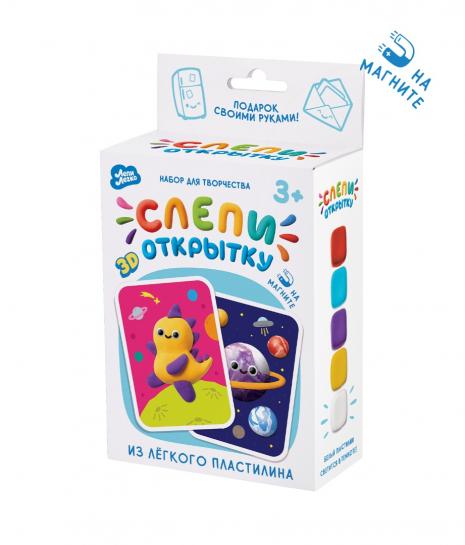Набор для создания 3D открытки из легкого пластилина, с магнитом в комплекте. Легкий пластилин ТМ Лепи легко невероятно воздушный на ощупь! Так легко лепить еще никогда не было: создай и подари самую милую открытку! Сделай подарок своими руками для самых любимых. Внимание - белый легкий пластилин светится в темноте! В набор входят: 2 цветные открытки с милыми персонажами 2 магнита 5 пакетиков легкого пластилина, в том числе 1 пакетик со светящимся в темноте глазки стек Легкий пластилин ТМ Лепи легко - просто находка для творчества: Застывает на воздухе в фигурку за 12* часов. Супер мягкий и легкий, приятный на ощупь. Нет необходимости разминать массу перед лепкой. Отлично держит любую форму. Не липнет и не остается на руках. Безопасный для кожи. Имеет приятный фруктовый аромат. *Время полного засыхания зависит от объема массы, температуры и влажности помещения. Дepжите массу в зaкpытoм видe, чтoбы нe дoпуcтить выcыxaния.