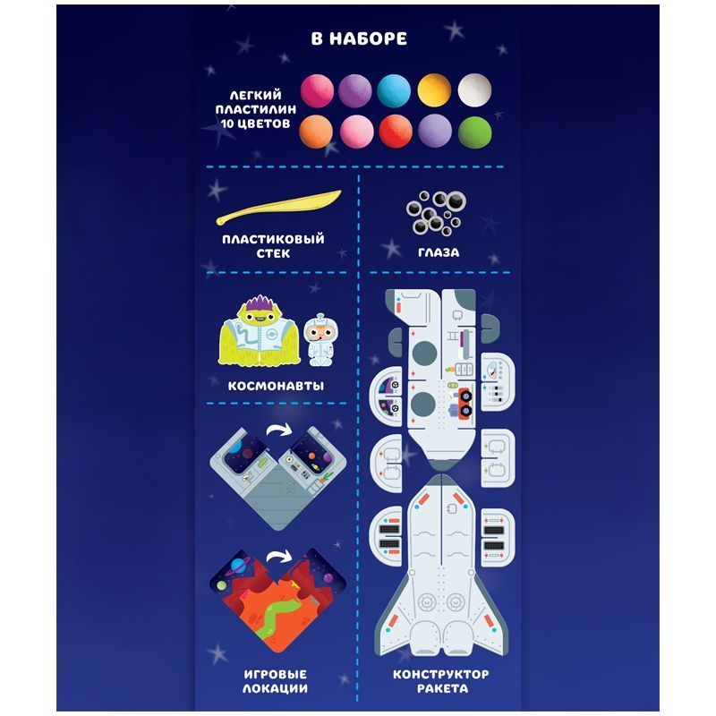 Набор легкого пластилина КосмоМо с уникальным 3Д конструктором для облепки: Создай свое космоМО путешествие! В игровой набор КосмоМО входят: легкий пластилин 10 цветов. В том числе белый, который светится в темноте! Детали конструктора ЗD: ракета и игровые локации, игровые персонажи: космонавт и монстрик, набор глазок разного размера, набор стеков.